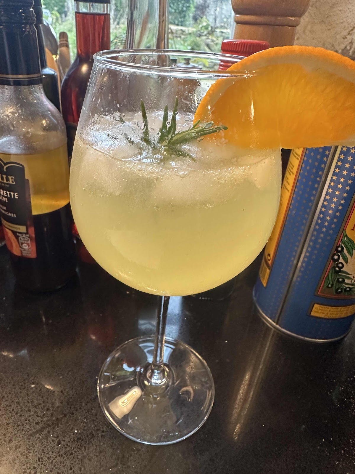 + ice cubes, lemon slice, orange slice and rosemary sprig for serving.